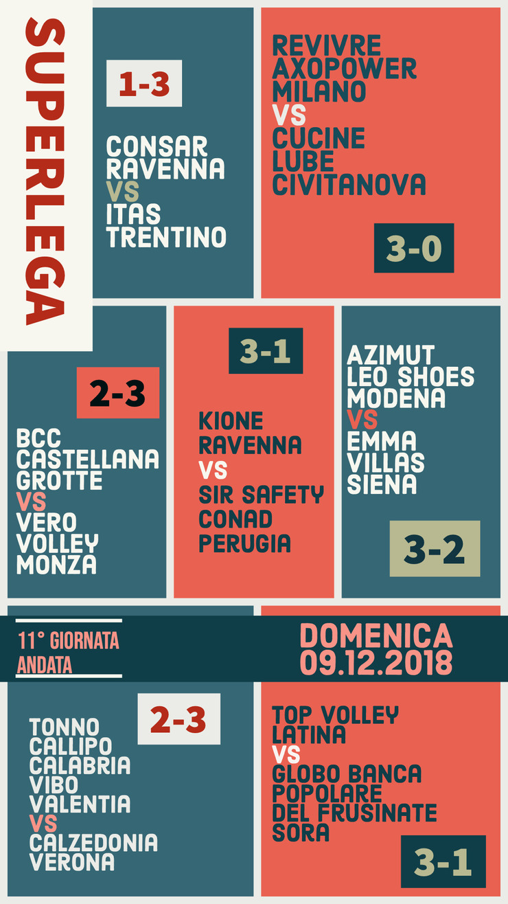 Sconfitta di Civitanova e Perugia rispettivamente a Milano e Padova. Modena riesce a vince a Siena solo al quinto set.