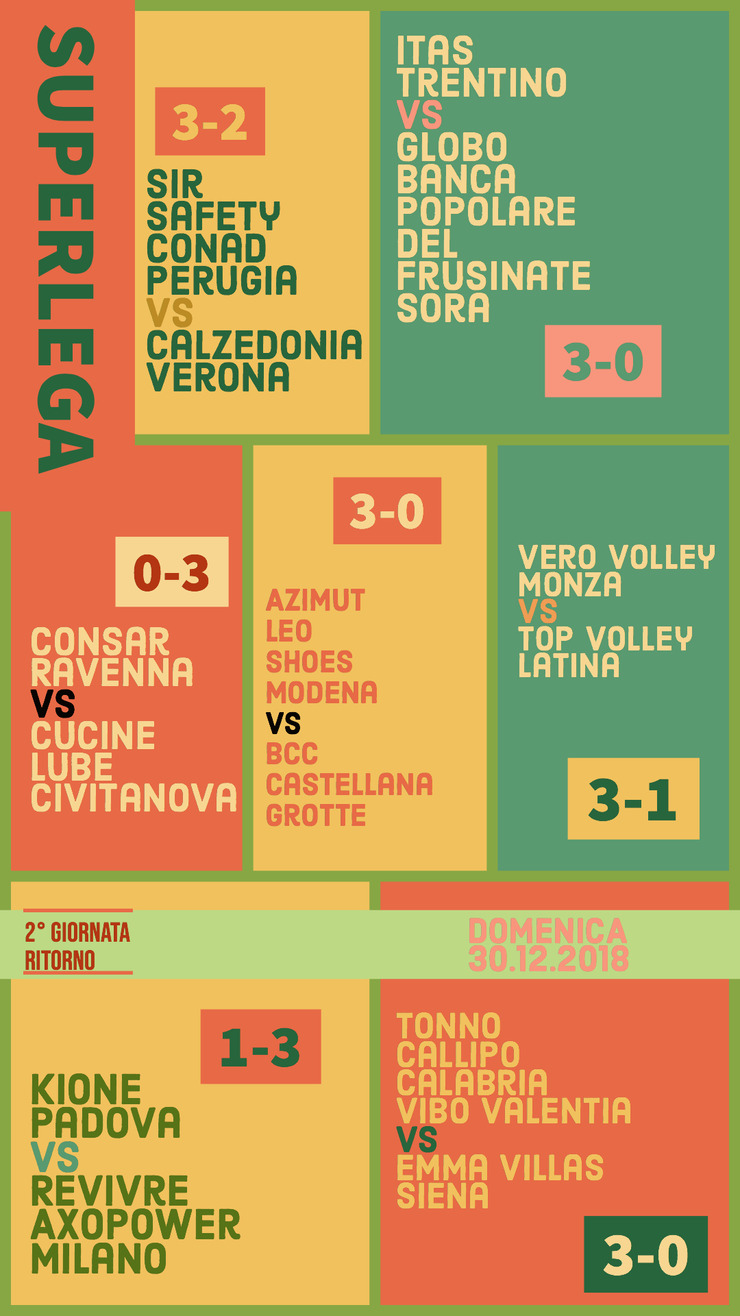 Trento conquista la diciottessima vittoria di fila. Perugia vince al tie break contro Verona.