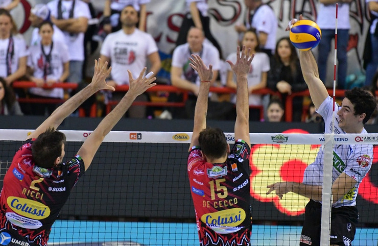In avvio di secondo parziale piazza il doppio ace consecutivo (4-2) e sul 7-4 coach Baldovin chiede subito time out. Sull’ace dell’8-4 a firma di De Cecco, Barnes rileva Cirovic. Col turno al servizio di Travica, Padova accorcia le distanze (12-10) ma qualche errore di troppo permette agli umbri di allungare 19-14 dopo l’attacco out di Louati. Il tecnico della Kioene richiama i suoi in panca, ma Torres viene limitato due volte consecutive a muro (23-15). A chiudere è il primo tempo di Ricci intercettato da Polo (25-18).