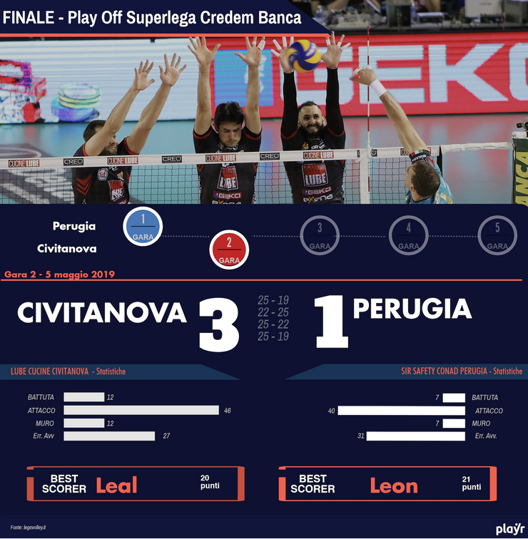 Civitanova lavora meglio a muro e in battuta con 20 punti firmati Leal. In doppia cifra anche Juantorena e Sokolov.