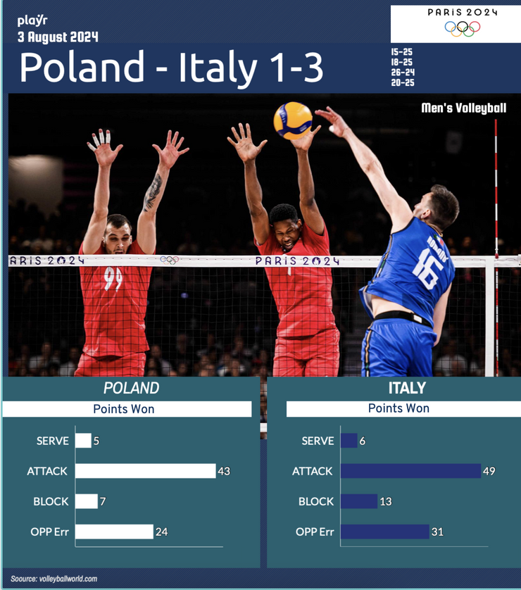 Giannelli e compagni hanno dimostrato grande determinazione e abilità tecnica, controllando il gioco per gran parte del match. Nonostante una battuta d'arresto nel terzo set, la squadra è rimasta concentrata, chiudendo la partita con una prestazione solida nel quarto set. Romanò è top scorer della partita con 20 punti.
