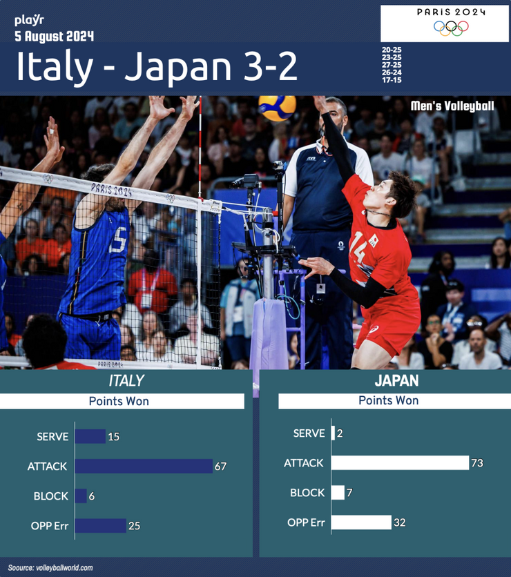 Il match ha visto protagonisti Simone Giannelli, Alessandro Michieletto e Daniele Lavia, con quest'ultimo che ha dato un contributo decisivo nei momenti chiave. Il Giappone, guidato da un eccezionale Yuki Ishikawa (autore di 32 punti), ha dimostrato una difesa impenetrabile e un gioco di altissimo livello, rendendo la vittoria degli azzurri ancora più significativa.. Il match contro il Giappone è stato seguito da oltre 2,4 milioni di spettatori su Rai 2, con uno share del 21,3%, testimoniando il grande interesse e il sostegno del pubblico italiano.