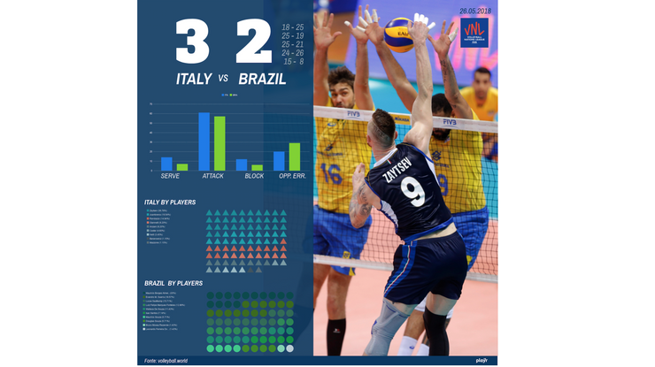 Si chiude al quinto set lo scontro contro il Brasile. L'Italia vince dopo aver perso il quinto set, Zaytsev inarrestabile con 30 punti.