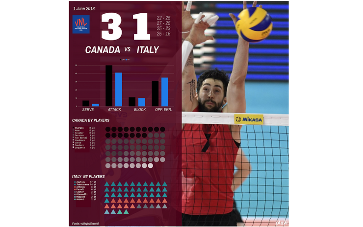 Inizia con una sconfitta il secondo weekend della Volleybal Nations League. Gli azzurri escono sconfitti dallo scontro contro il Canada 1-3 (25-22, 25-27, 23-25, 16-25),