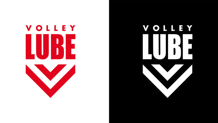 Il marchio è l’acronimo di Lube Volley. Nasce da una griglia di forma quadrata, in cui si configurano delle strisce date dall’alternanza di positivo e negativo. Le strisce incrociandosi formano le due lettere L e V, i due segmenti hanno ugual spessore. Il tutto è ruotato di -45°, la L diviene contenitore della V. Nasce un unico segno, che per un gioco di pieni e vuoti dà l’idea della terza dimensione.