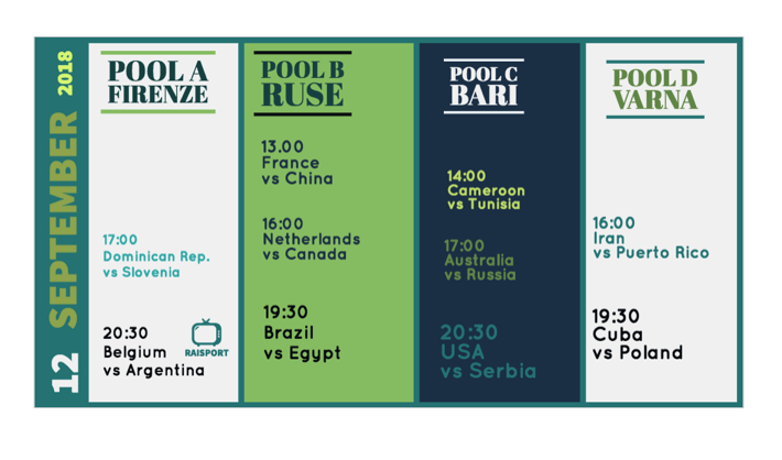 In differità sarà possibile vedere Cuba vs Polonia alle 00:20 del 13 settembre e USA vs Serbia in differita alle 11:00 del 13 settembre sempre su RaiSport