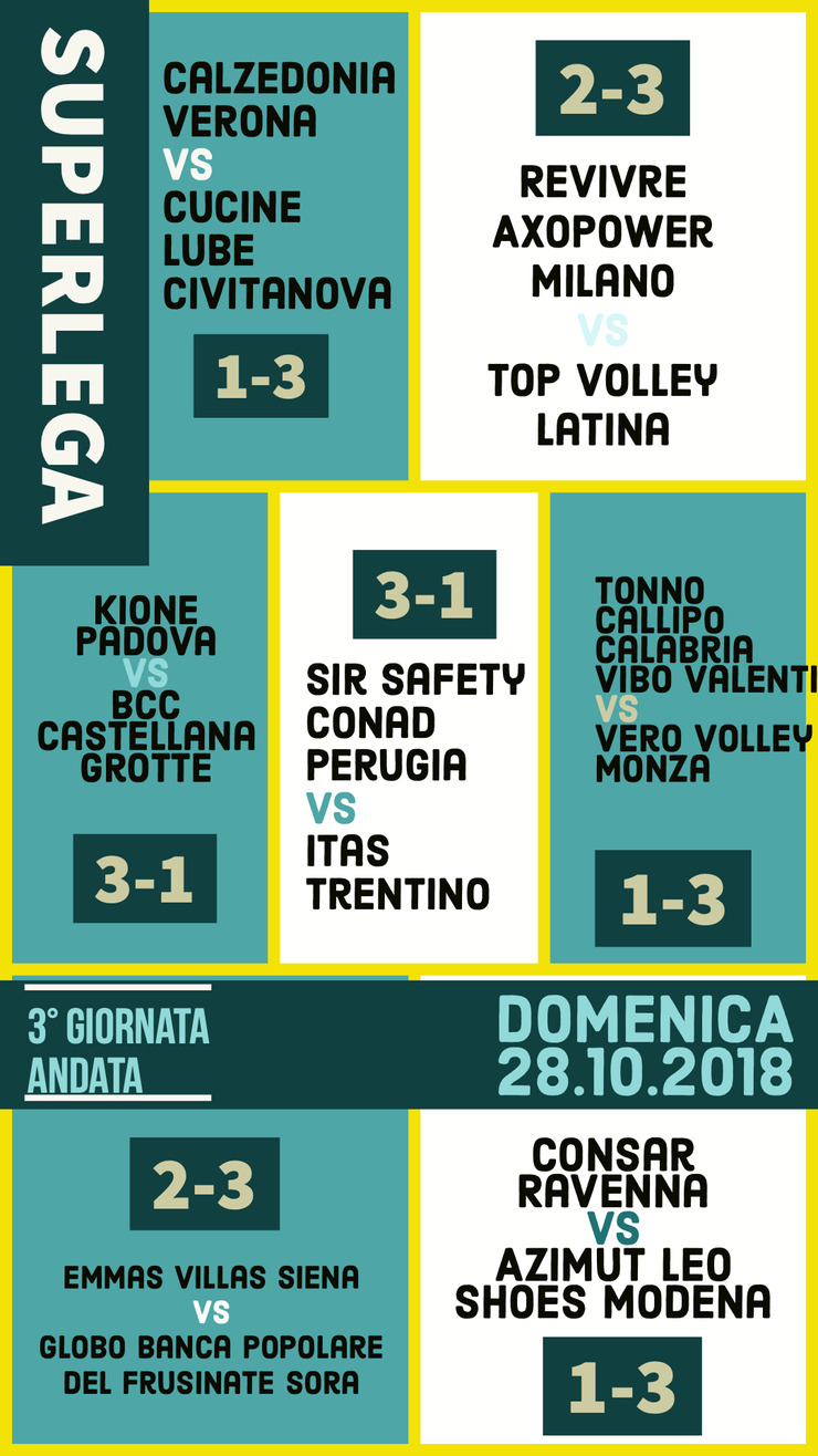 La terza giornata si conclude con Perugia e Civitanova a punteggio pieno con le rispettive vittori 3-1 contro Trento e Verona.