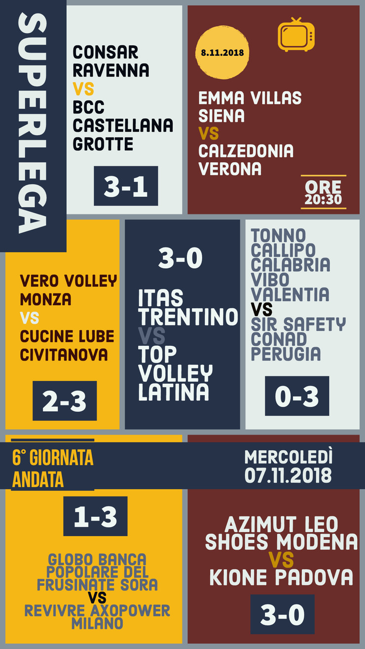 In attesa della partita di domani Emas Villas Siena vs Calzedonia Verona, la sesta giornata vede per 3-0 di Trentino, Perugia e Modena mentre la Lube vince al quinto set contro Monza.