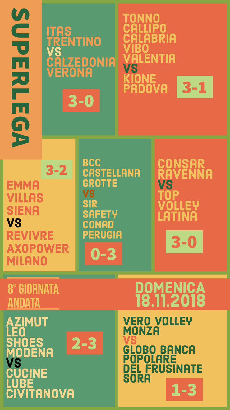 Perugia continua a non perdere punti, è sola in vetta con 24 punti in 8 giornate. Sora vince a Monza, vittoria anche per Vibo contro Padova e Ravenna contro Latina.