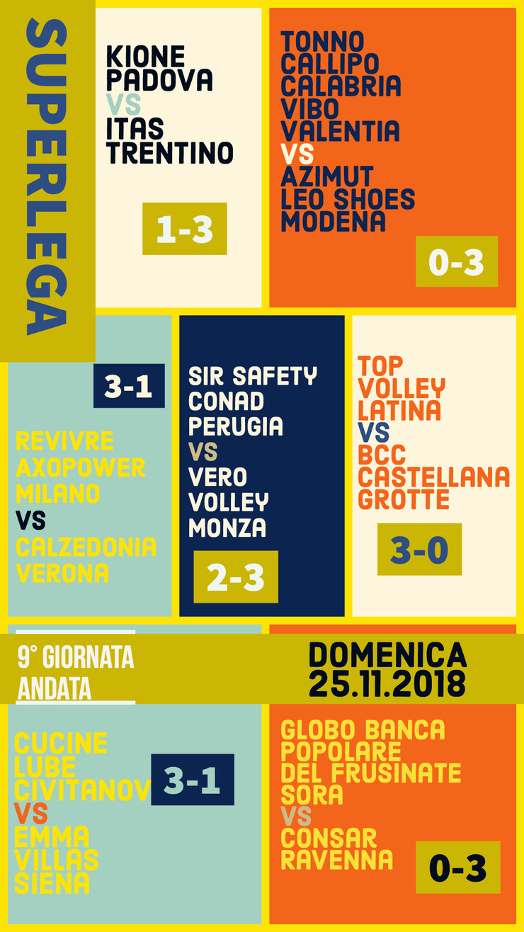 Successo anche per Modena in Calabria e Trento a Padona. Milano vince contro Verona. Vittoria anche per Ravenna e Latina.