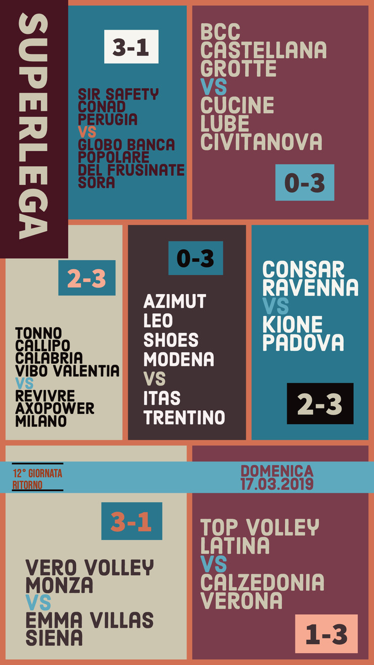 I tre punti contro Sora garantiscono alla Sir il primo posto e la Champions per la prossima stagione. Trento espugna il PalaPanini e resta salda al secondo posto. Modena raggiunta al quarto da Milano che vince a Vibo. Vittoria anche per Civitanova , Verona e Padova