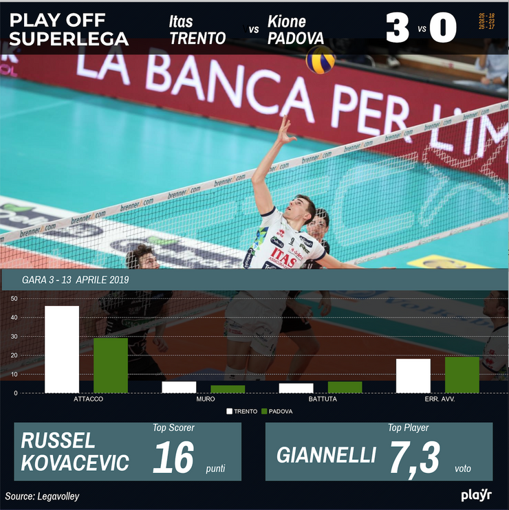 Finisce 3-0 la sfida di Trento contro Padova. I ragazzi di Lorenzetti conquistano l'accesso in semifinale con Russell e Kovacevic che realizzano entrambi 16 punti in tre set.
