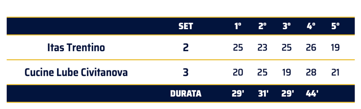 Dopo il cambio di campo la Cucine Lube cambia decisamente atteggiamento e inizia a lavorare benissimo nella fase di break point: Sokolov, Juantorena e il rientrante Leal fanno male alla ricezione trentina che sbanda (1-4, 4-8). L’Itas Trentino fatica anche in attacco ed è meno precisa di altre volte a muro; gli ospiti accelerano ancora (7-13 e 8-15); il set sembra già finito ma sul 13-21 i gialloblù si ridestano, sfruttano un passaggio a vuoto di Simon (18-21) e un turno al servizio di Russell condito anche da un ace, riportandosi incredibilmente sul 20-21. La parità arriva a quota 22 con un muro imperioso di Lisinac su Sokolov. Allo sprint però decide un break point dello stesso opposto bulgaro (23-25).