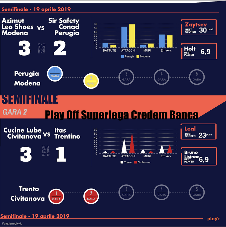 Equilibrio per la semifinale Perugia vs Modena, mentre Trento non riesce a fermare Civitanova.