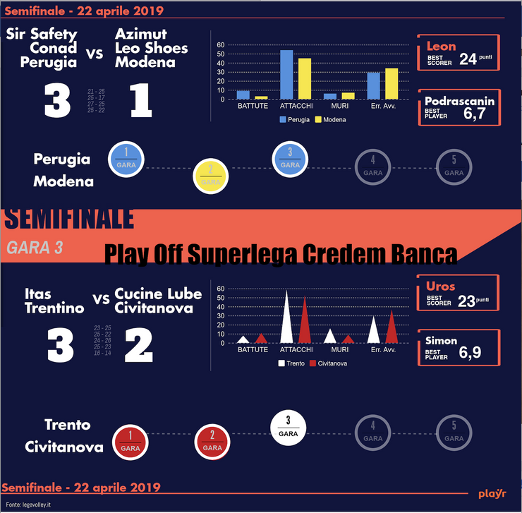 #Supelerga: Perugia si porta in vantaggio nei confronti di Modena, Trento ferma Civitanova e si va a gara 4.