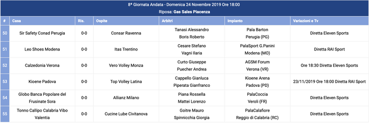 La Lube, prima in classifica, sfiderà Vibo Valentia mentre ci sarà il big match tra Modena e Trento entrambe seconde in classifica a 18 punti. La partita sarà trasmessa in diretta su Rai Sport.