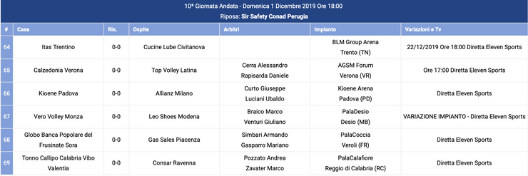 Perugia riposa, mentre lo scontro Trento - Civitanova è spostato al 22 dicembre. Modena sfida la squadra di Monza, e Milano sarà in trasferta a Padova.
