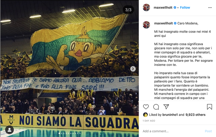Io guardo il mio tempo qui a Modena come il più felice che abbia mai giocato a pallavolo professionale, e se potessi lasciare un sorriso al PalaPanini, lo farei. È un peccato come sia finita, e ovviamente tutti noi desideriamo di poter correre in campo ancora una volta. Ma questa pandemia ci ha ricordato che ci sono cose più importante della pallavolo. Mentre la città raccoglie lentamente i pezzi, so che Modena tornerà più forte che mai, uniti. Con la comprensione di quanto sia prezioso il nostro tempo insieme.