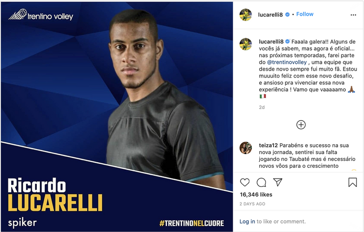 La notizia è stata comunicata da Trentino Volle come "Il colpo di mercato dell'anno! Ecco il formidabile schiacciatore Ricardo Lucarelli" e dal giocatore sul proprio profilo Instagram.