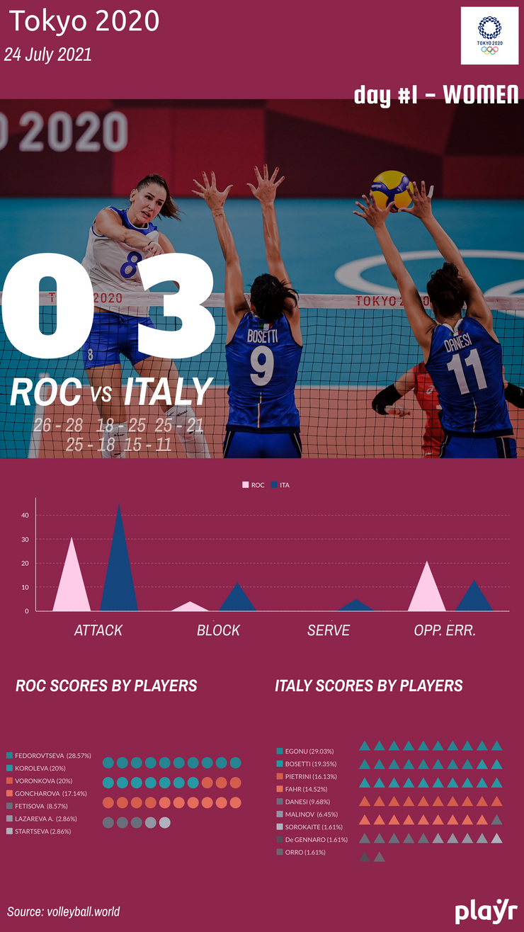 L'esordio della nazionale femminile è stato convicente. L'Italvolley femminile batte 3-0 (25-23, 25-19, 25-14) le russe del ROC. Diciotto punti per Egonu: "Abbiamo rotto il ghiaccio, all'inizio c'era tanta emozione". Il 27 luglio di nuovo in campo contro la Turchia.