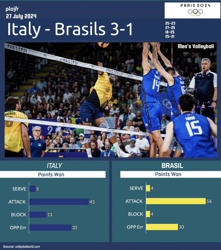 Nonostante l’ottima prova del giovane brasiliano Darlan - che da solo totalizza 25 punti - l’Italia ha trovato risposte straordinarie da tutti i suoi titolari. Romanò è stato particolarmente incisivo con 20 punti, risultando decisivo nei momenti cruciali del match. Giannelli ha orchestrato l'attacco con maestria, permettendo a Michieletto (13 punti) e Lavia (12 punti) di esprimersi al meglio. La solidità a muro è stata una delle chiavi del successo, con Galassi, Russo e Lavia protagonisti.