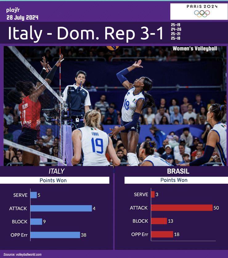 Le ragazze di Julio Velasco hanno iniziano iniziano bene le vincitrici dell'ultima Nations League, imponendosi nel primo set con un 25-19. La Repubblica Dominicana ha però complicato l’esordio olimpico dell’Italia vincendo il secondo set 26-24. Nel terzo set, l’Italia ha ripreso il controllo, grazie a una Egonu in grande spolvero, chiudendo il parziale 25-21. Nel quarto e ultimo set, le azzurre hanno dominato con un 25-18, garantendo così la vittoria finale.