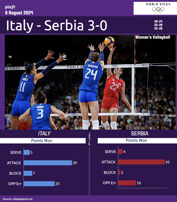 Paola Egonu è stata ancora una volta protagonista con una prestazione eccezionale, stravincendo il duello con la serba Boskovic. Ma è stata l'intera squadra a brillare, con contributi fondamentali anche da parte di Anna Danesi e Sarah Fahr.