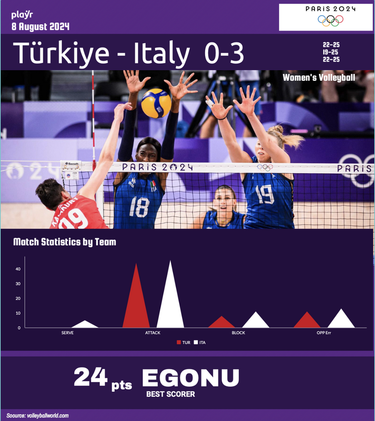 La squadra di Julio Velasco ha dimostrato grande coesione e maturità tattica, gestendo con freddezza ogni tentativo di rimonta della formazione turca, allenata da Daniele Santarelli. Un risultato che porta l'Italia a un passo dalla medaglia d'oro, che sarà contesa domenica 11 agosto alle ore 13:00 contro gli Stati Uniti.