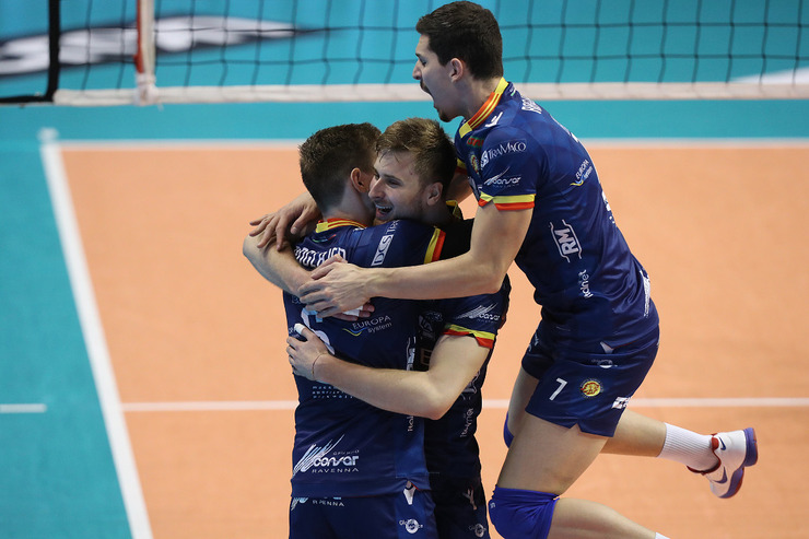 Primo set Le due squadre vanno avanti di pari passo senza break fino al 7-6, quando Buchegger non sbaglia la rigiocata del +2 ravennate: 8-6. La risposta dei greci arriva con l’ace di Bohme, che vale il pareggio (8-8), ma anche Orduna colpisce dalla linea dei nove metri: 10-8. Bohme a muro riporta in equilibrio il match (13-13), con il tedesco che si ripete per il sorpasso: 14-15. Ci pensa Buchegger a far pendere l’ago della bilancio di nuovo dalla parte della Bunge (16-15), che si allontana in modo ulteriore grazie alla schiacciata fuori di Aleksiev (17-15) e a una bordata di Buchegger: 19-16 e time out Benitez. Due punti di fila di Petreas annullano il gap degli ospiti (19-19), che vanno sul 22-23, ma Poglajen e Buchegger ribaltano il risultato: 25-24. Al primo set point l’argentino pesca il jolly, trovando l’ace che fa esultare il Pala De André: 26-24.