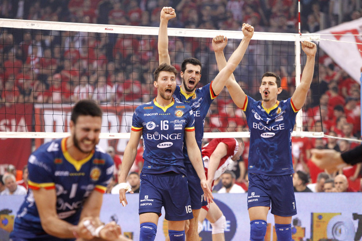 Sestetti iniziali I due tecnici confermano i sestetti dell’andata. Fernando Munoz Benitez disegna il suo Olympiacos con il palleggiatore Drzyzga, l’opposto Oivanen, gli schiacciatori Aleksiev e Rauwerdink, i centrali Petreas e Bohme e il libero Stefanou, che in difesa si alterna con Daridis. Sul fronte Bunge Fabio Soli risponde con Orduna al palleggio in diagonale con Buchegger, Marechal e Poglajen bande, Georgiev e Diamantini al centro e Goi in seconda linea.