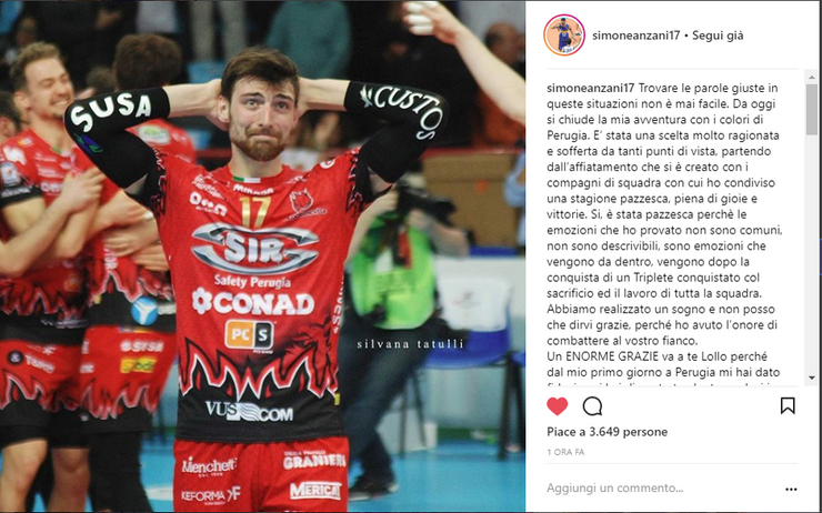 La notizia arriva sia sul profilo Instagram del centrale sia sul sito di modenavolley.it. Anzani lascia la Sir Perugia dopo una stagione da incorniciare e si appresta a una nuova avventura in casa Modena dove ritroverà Zaytsev. Ecco il messaggio pubblicato su Instagram: