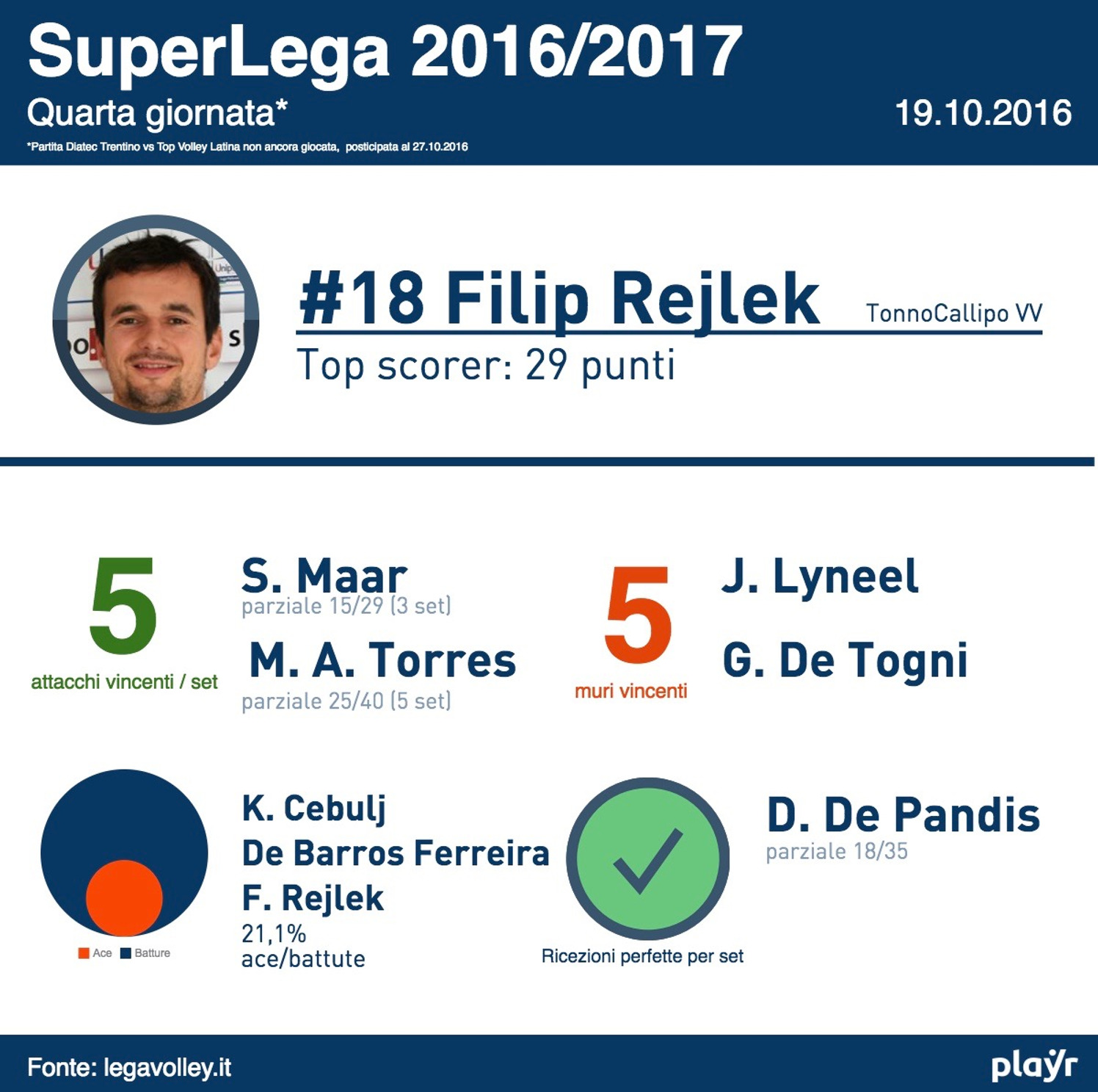 La quarta giornata di #SuperLega. La partita Diatec Trentino - Top Volley Latina sarà giocata il 27 ottobre 2016