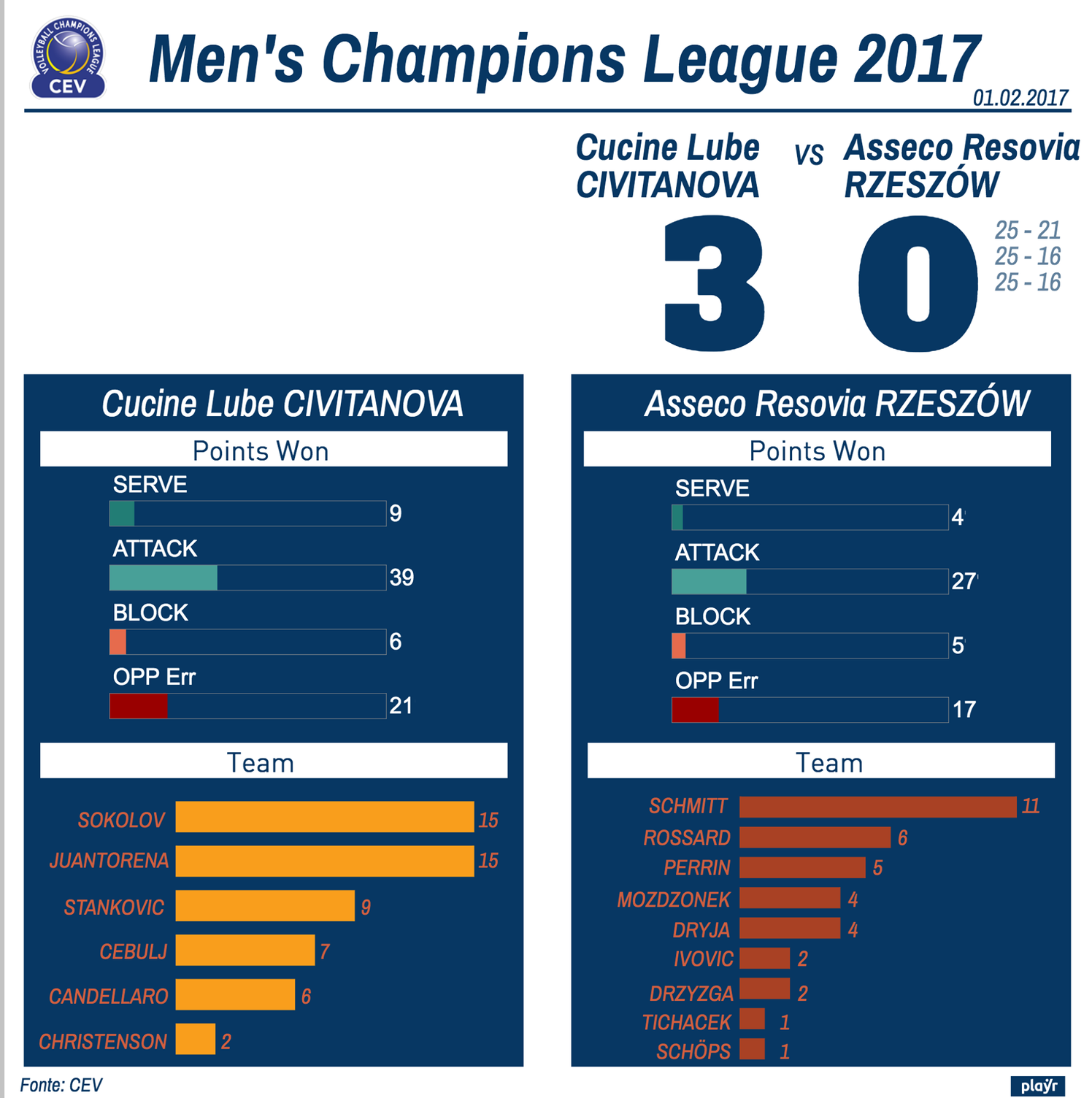 Cev Champion League: Cucine Lube CIVITANOVA vince 3 a 0 contro Asseco Resovia RZESZOW.