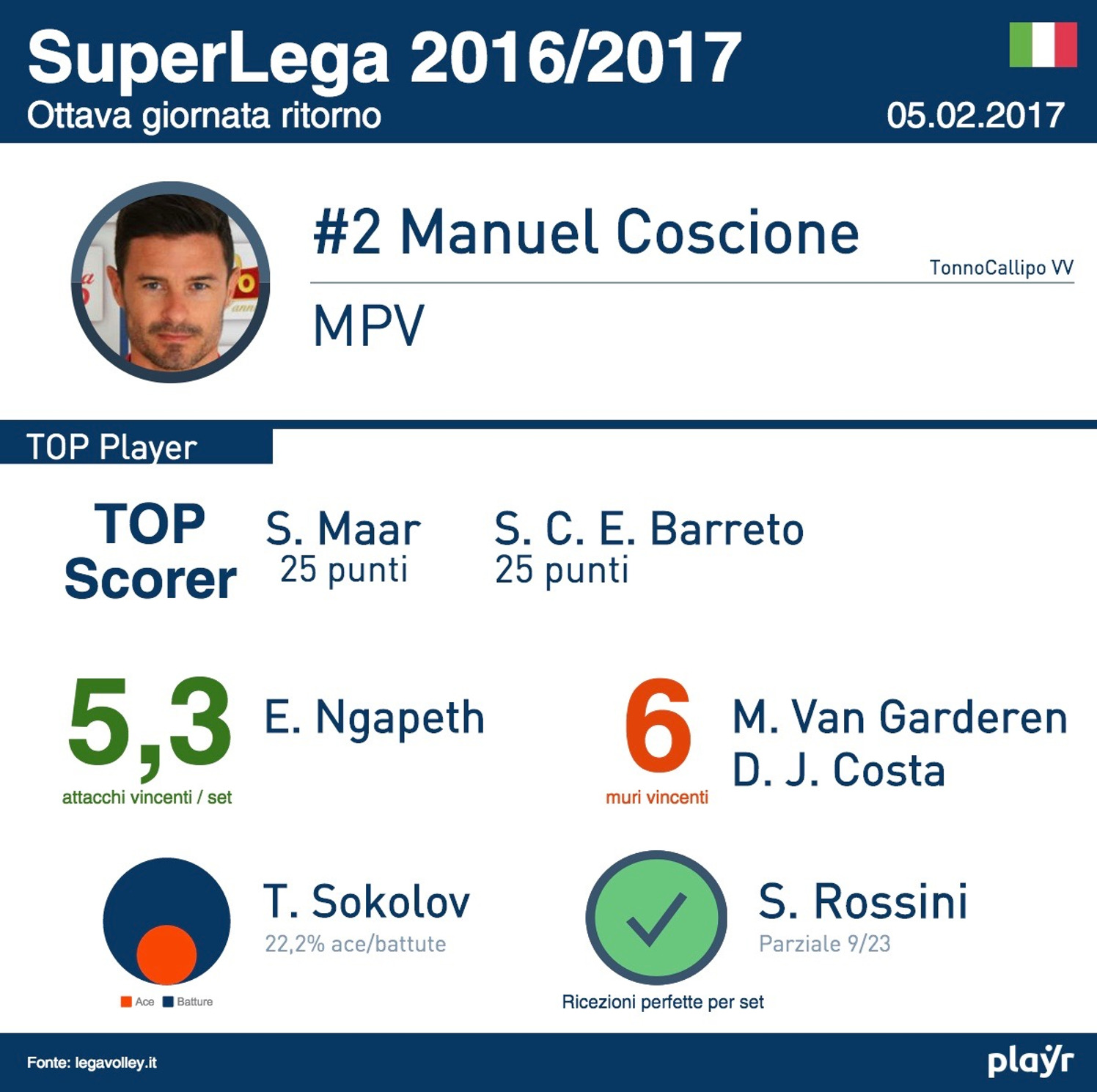 Ottava giornata di ritorno: Modena perde a Verona, mentre la Lube espugna Perugia.