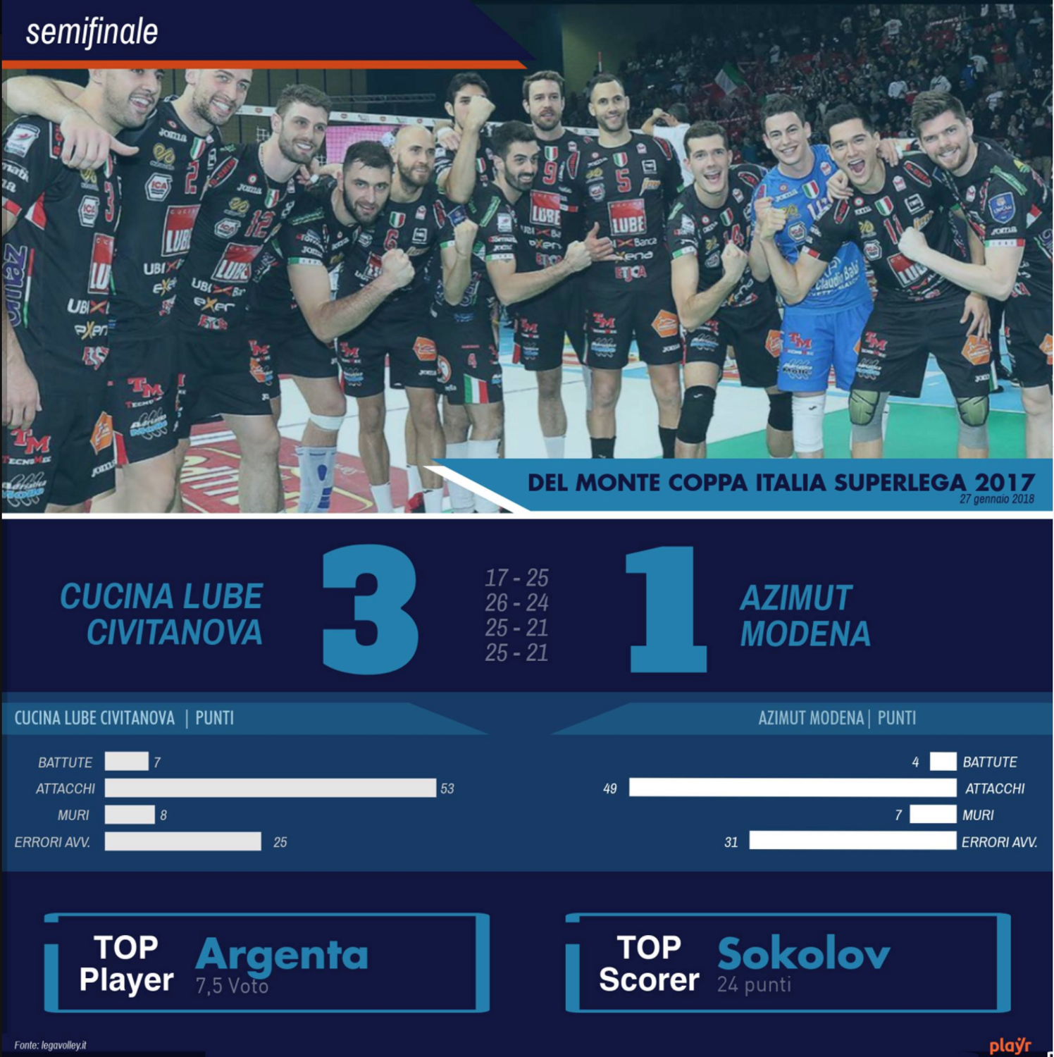 Cucine Lube Civitanova-Azimut Modena 3-1 (17-25, 26-24, 25-21, 25-21)