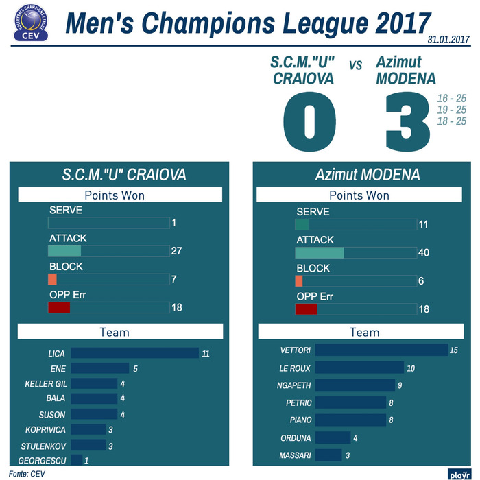 Modena vince e si conferma al primo posto nella Pool D. La qualificata agli ottavi di finale è ma...