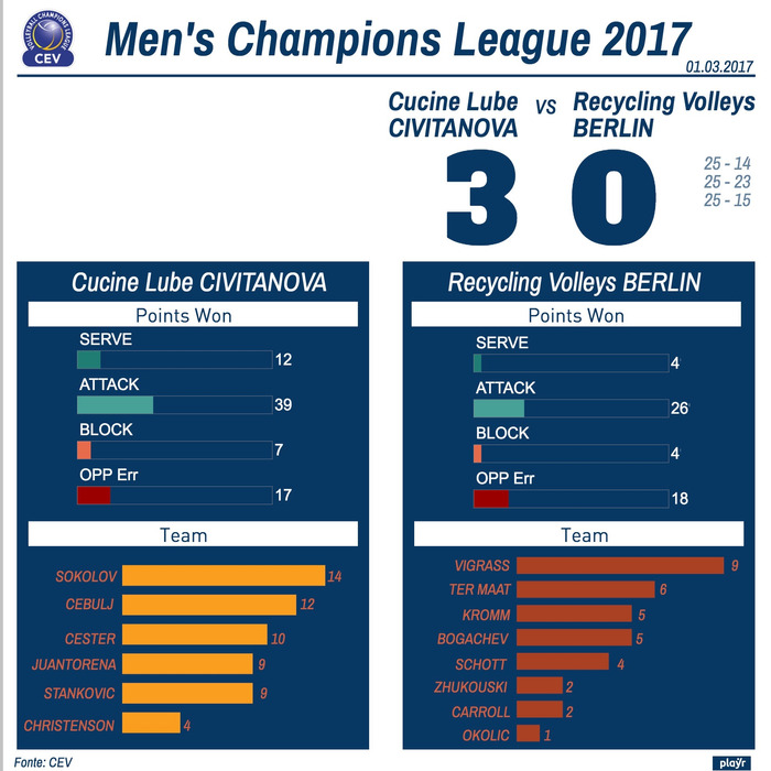 Cev Champion League: Cucine Lube CIVITANOVA vince 3 a 0 contro Asseco Resovia RZESZOW.